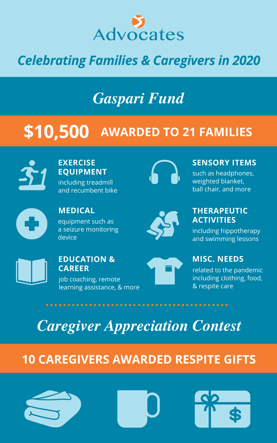 “This has been an especially challenging year for caregivers, with many families facing reduced income and decreased access to respite care and day services for their loved one,” says Jeff Keilson, senior vice president of strategic planning at Advocates. “The goal of the Gaspari Fund is to help more families make it possible for their loved ones with disabilities to live a better life in ways that make sense to them.”